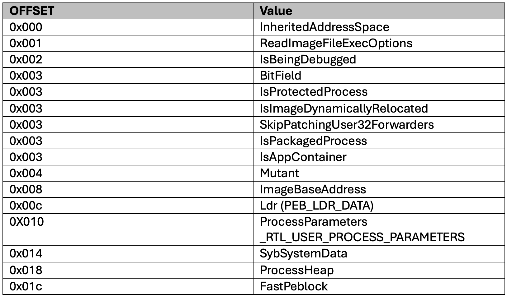 Offsets within the PEB have certain values as shown below.
