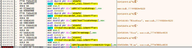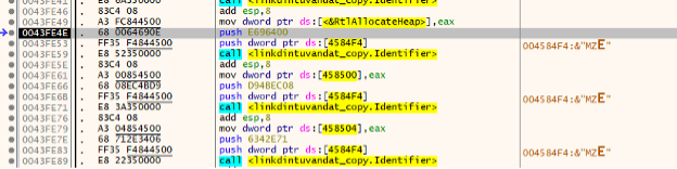 Clicking on the value of the “mov ebx, dword ptr ds:[<&RtlAllocateHeap>]”, bring you to the address location of this instruction. In this case it is 0x43dc05, and later in the code at address 0x43dc1c there is a call to ebx. Which will call for the API “RtlAllocateHeap”.
