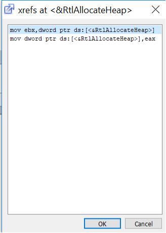 Using xrefs for the address of RtlAllocateHeap, can see two entries. One is when eax is moved into the location. The other is moving the address of RtlAllocateHeap into the value of ebx.