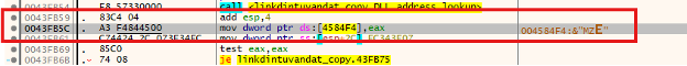 The address location of “ntdll.dll” is then pushed into data address location of 4584f4.