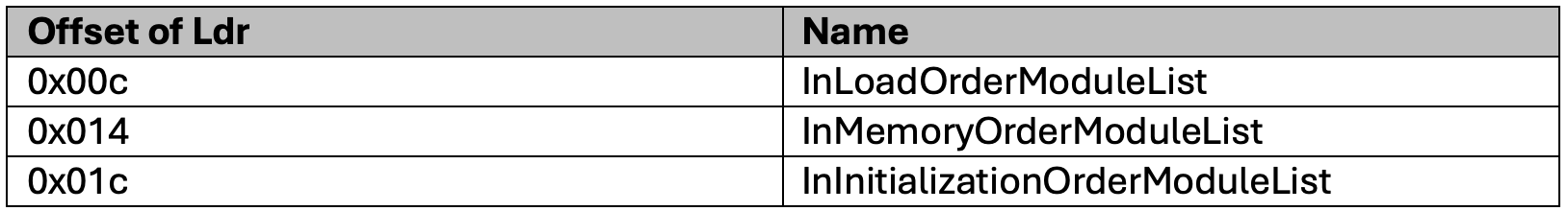 InLoadOrderModuleList: Maintains the address of the modules as they were loaded into the process.