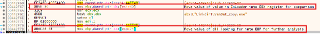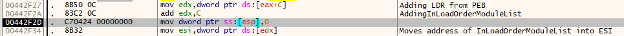 Once this is completed it will look up the values that are in the InLoadOrderModule into a register to be used later. The malware will also move the value of the dll that it is looking for to be compared into another register.