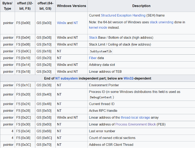 The PEB address is stored in the register “FS:[30]” in 32-bit applications and “GS:[60]” in 64-bit applications. FS & GS are registers that point to the Thread Environment Block (TEB). The TEB contains a pointer to where the PEB is. The TEB is a gateway in an application to access the PEB, by the threads it contains. A table on Wikipedia about the TEB is in Figure 1.