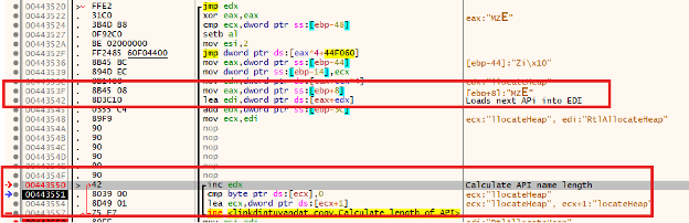 At address 0x443542 see that the value of eax and edx is moved into edi. The value of edi contains the name of the dll that is being identified. In this example, while not shown edi has the address of 0x778a7c4, which contains the value of “RtlAllocateHeap”. As noted in Figure 18, the list of APIs within the dll are listed alphabetically.